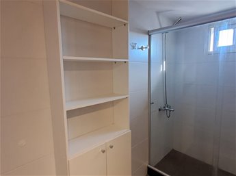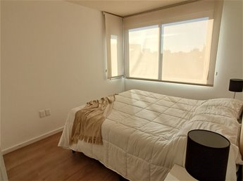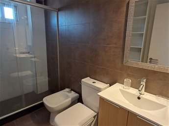 Baño completo con mampara. Dormitorio de buen tamaño con placard y sommier de 2 plazas. Terraza con excelente vista a la ciudad.
