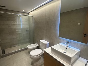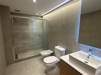 Baño completo muy cómodo y moderno con placard, mampara de cristal, espejo y calefón.